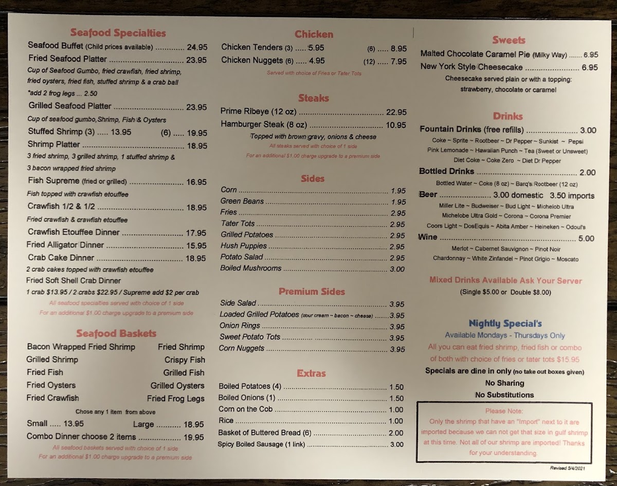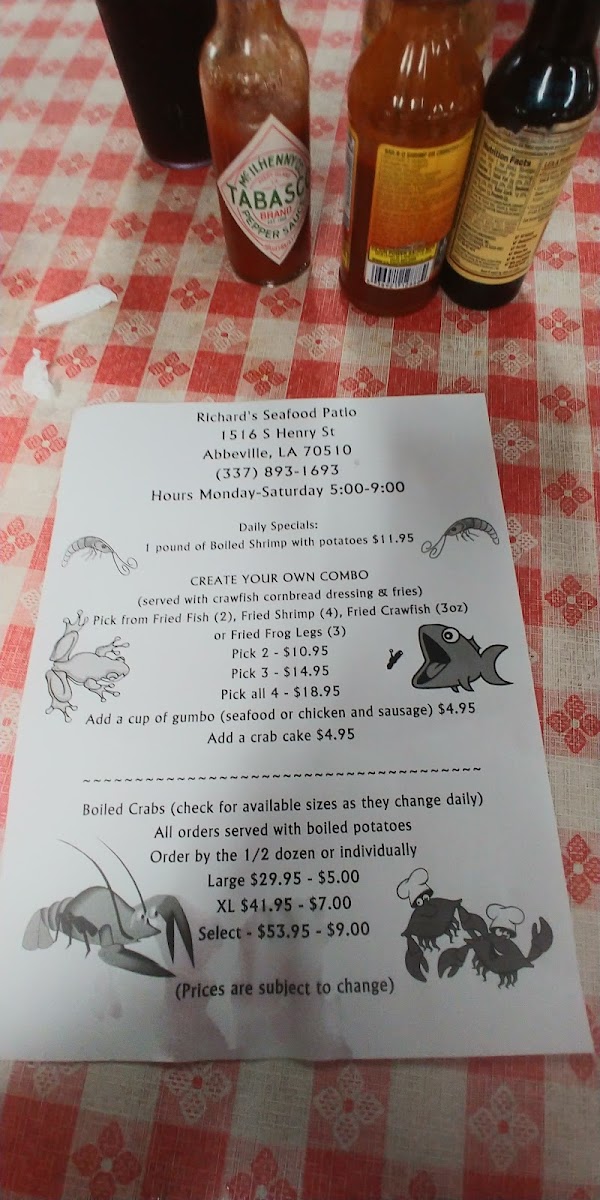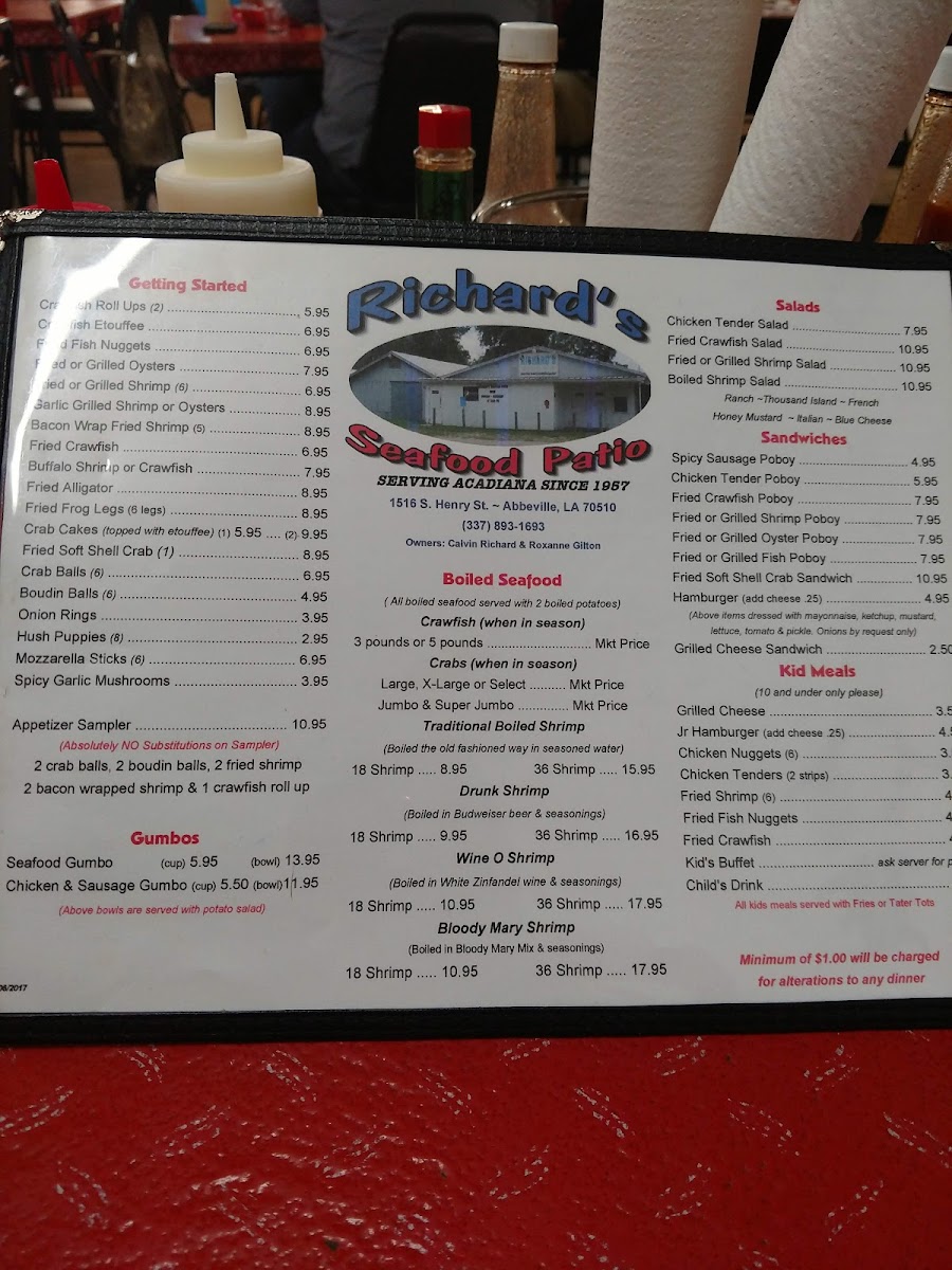 The menu at Richard's Seafood Patio offers a straightforward, no-frills approach to classic Louisiana seafood. Designed for casual dining, it features comforting dishes that reflect the rich culinary traditions of Cajun and Creole cooking. Whether stopping by for a relaxed lunch or a laid-back dinner, guests can expect hearty portions served in a welcoming, unpretentious setting.